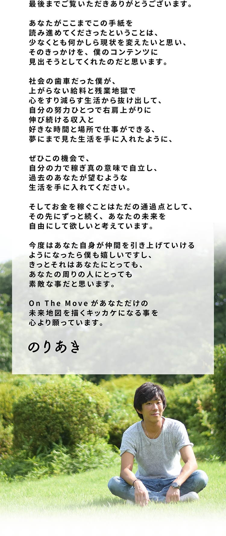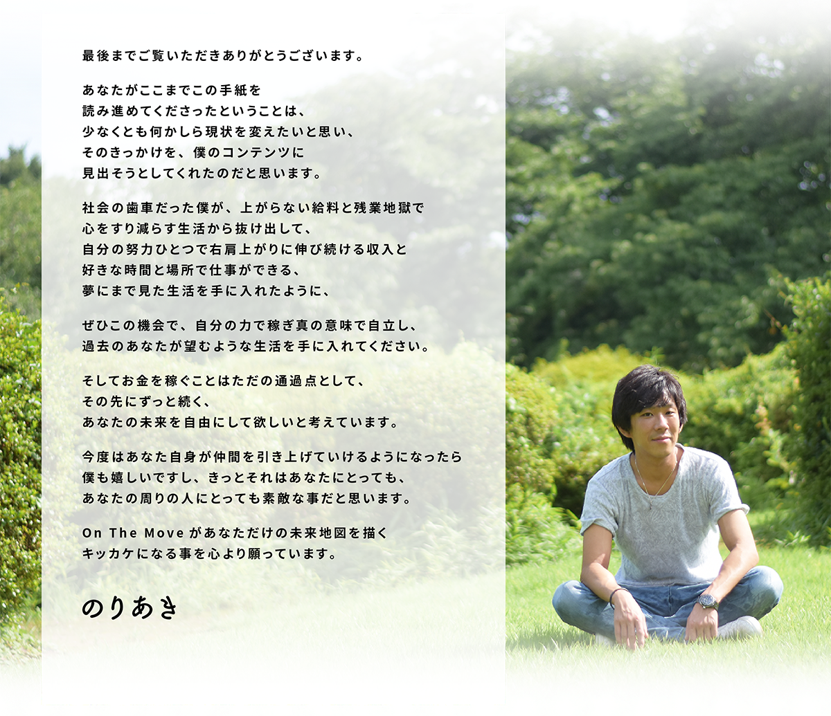 そこで、のりあきさんのことを知ったのですがブログを読んでいくうちに「この人すごいな、この人についていこう!」と決めました。