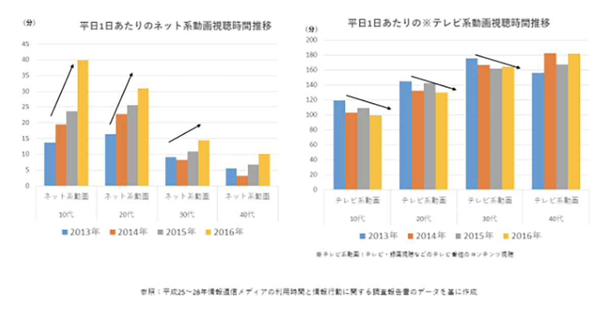しかし、ネット系動画の視聴時間は反比例するかごとく年々上昇しています。
